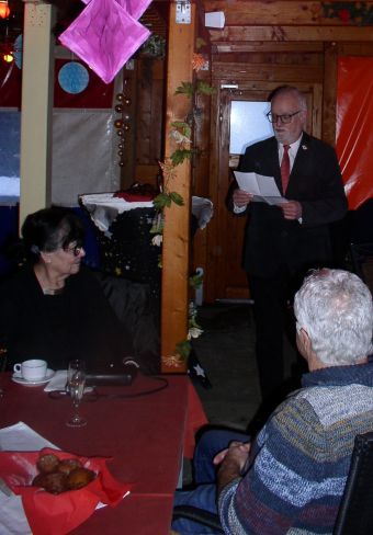 Verwelkomd werden we door onze bestuursleden Theo en Albert met een welkomstdrankje, en om 11.00 uur opende Theo, onze voorzitter, met zijn kersttoespraak het buffet.