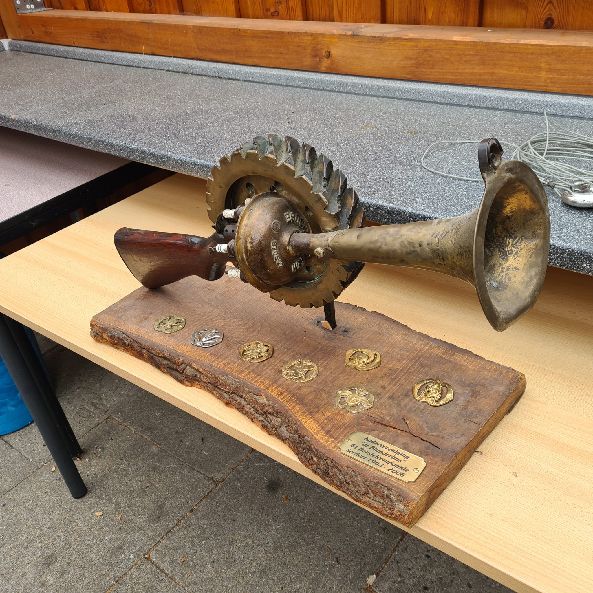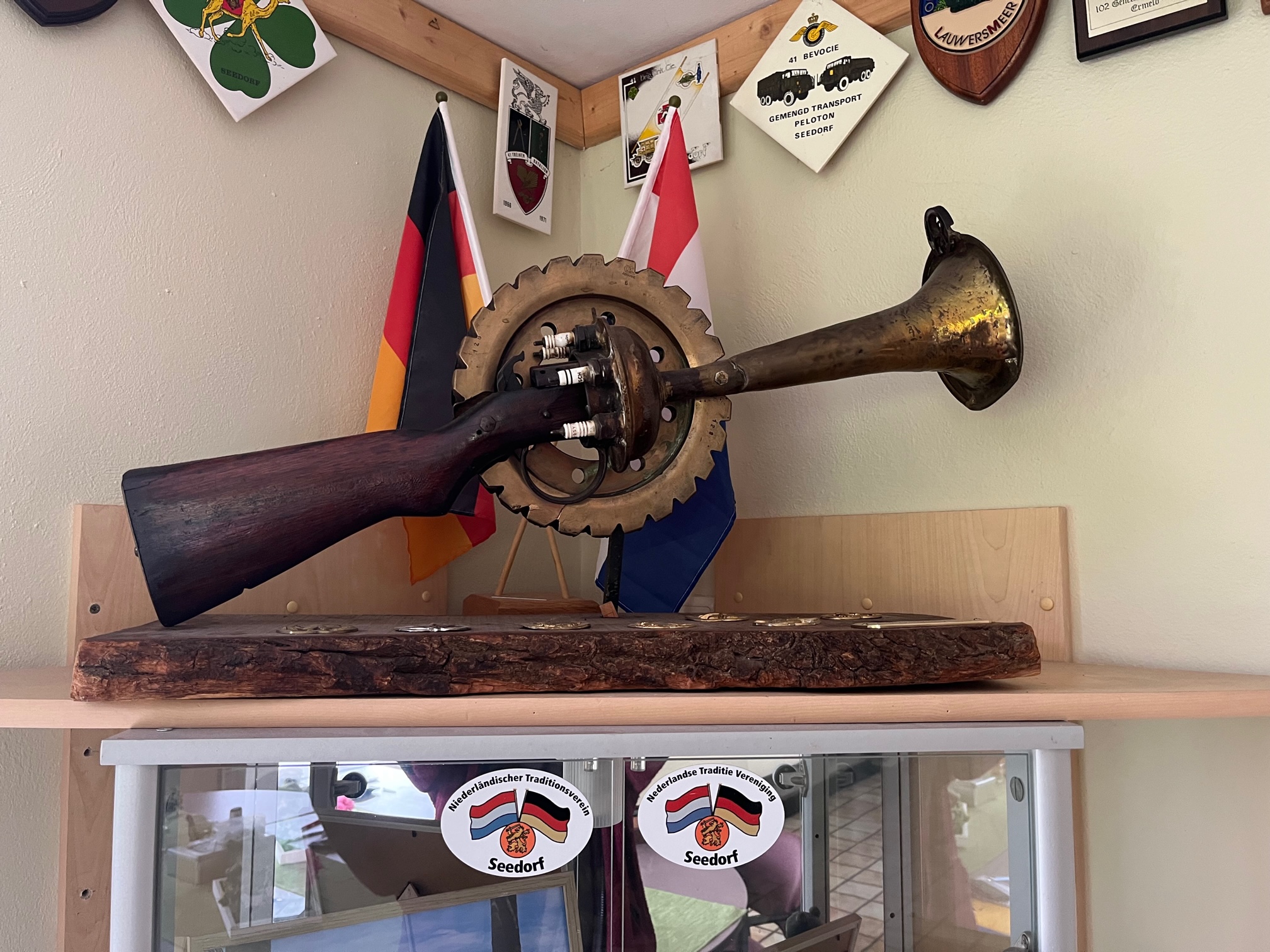 Bij het museum wilde men het weggooien maar een oud-hersteller heeft daar ingegrepen en veilig gesteld, waarna hij met mij Jacques van Leeuwen naar een mogelijkheid om een vaste standplaats te vinden voor deze mooie trofee waarbij de NTVS de uitgelezen plaats was voor dit uniek stukje huisvlijt zodat de cirkel rond is.