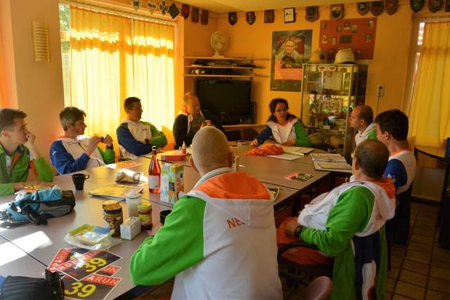Het team, bestaande uit 8 lopers, 3 masseurs, een coördinatrice, chauffeurs, fietsers voor de begeleiding en de cateringdames, kwam met uren vertraging vrijdagavond om 22.30 uur aan in ons clubgebouw, waar ze werden opgewacht door Albert de Geus. Ze hebben alles bij zich en hebben alleen onderdak en sanitaire voorzieningen nodig. Met datgene wat de NTVS ze kan bieden zijn ze ontzettend blij.