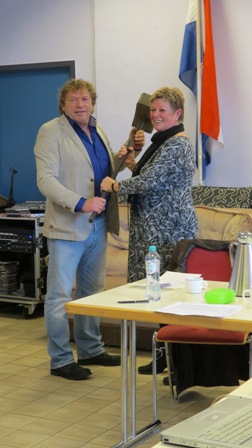Met het overhandigen van een enorme hamer heeft Theo Vonk het "stokje" na 8 jaren voorzitterschap overgedragen aan Geke van Nes.