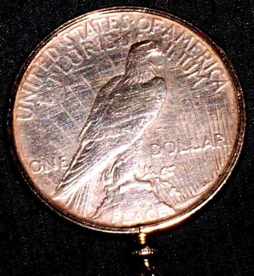 Deze zilveren US Dollar was in een grote ring geplaatst met een oogje daaraan om die als halsketting te kunnen dragen.