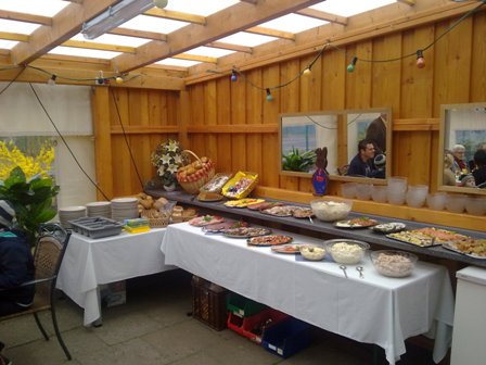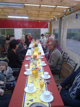 Mooi gedekte tafels, en prachtig buffet met allerlei ongelofelijk lekker zaken, (waaronder natuurlijk ook paaseieren van chocola) en 65 leden om van dit alles te genieten, zie daar de Paasbrunch 2012.