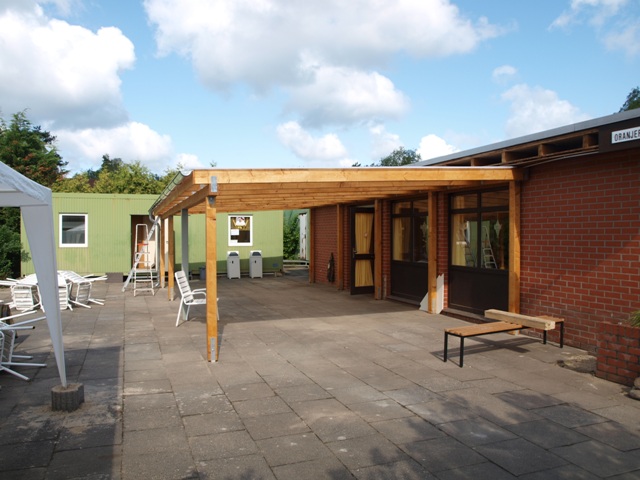 En nu volgt de finishing touch, de afwerking van het geheel. Er komt een houten wand aan de kant van de containers en misschien is het mogelijk de hele overkapping de hele ruimte af te sluiten met oprolbare zeilwanden. Dit alles zal worden bekeken door Mike Daudey, die daar verstand heeft èn die, heel belangrijk, een bedrijfje heeft dat zoiets zou kunnen maken. En dan heb je natuurlijk het punt verlichting en 'hoe houden we het warm' tijdens feesten en partijen en de brunches niet te vergeten. Met andere woorden: er valt nog het een en ander te doen, maar we houden u op de hoogte