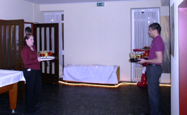 Daarna vertrokken de gasten naar de andere zaal, waar de band "Gourgous" inmiddels Six Pack geheten, zijn instrumenten had opgebouwd en waar de rest van de avond met muziek en dans gevuld werd.