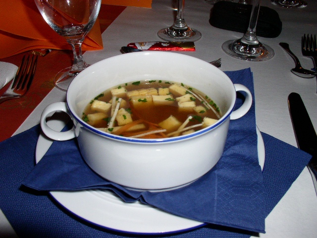 Tevens deelde ze de regels voor de komende avond mee en toen konden we richting eetzaal gaan, die feestelijk versierd was en waar we vriendelijk ontvangen werden.