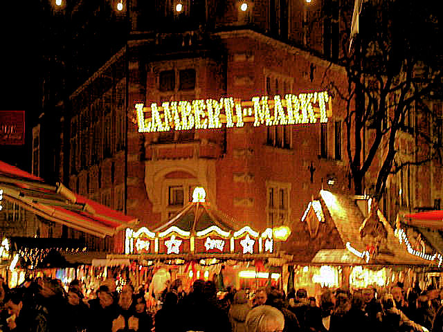 De kerstmarkt ligt tussen de Lambertikerk en het oude kasteel. De kasteelramen zijn van nummers voorzien die corresponderen met de luikjes op een adventskalender.