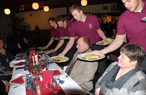 Evenals in de voorgaande jaren werd het 5-gangen menu geserveerd door een twintigtal jonge hofmeesters van het GHG. Alle gerechten waren prachtig gedecoreerd en een lust voor het oog en een streling voor de tong. Het personeel deed zijn best het de gasten naar de zin te maken en slaagde daar uitstekend in. Je kon merken dat ze plezier hadden aan hun werk. Na het kopje koffie toe stond voor iedereen vast: ze hebben het weer fantastisch gedaan.
