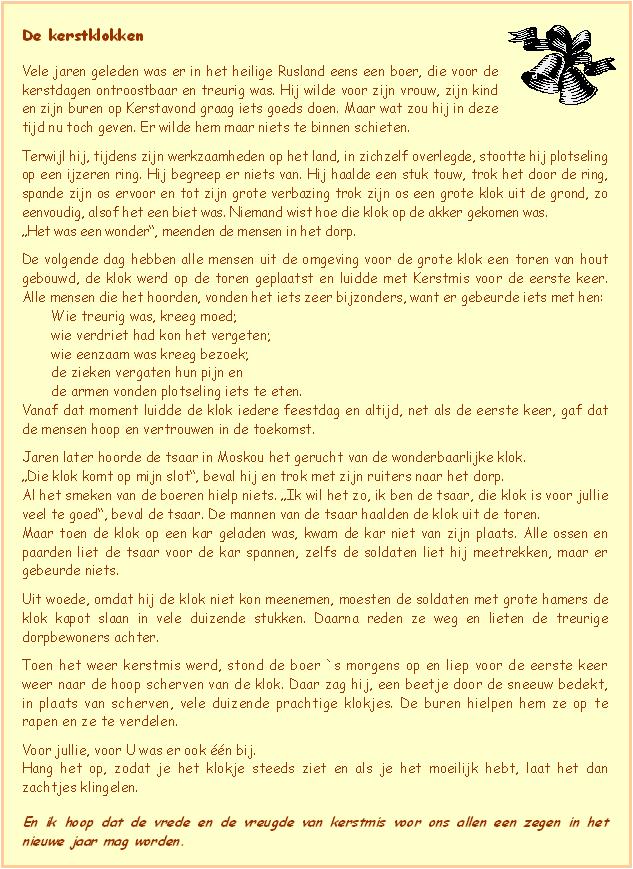 Op de feestelijk gedekte tafels stond tijdens het kerstdiner bij ieder bord een heel klein onschuldig klokje. Het viel helemaal in het niet naast het grote witte bord met het indrukwekkende deko-servet, het glanzende bestek voor het 5-gangen menu en de schitterende glazen voor de verschillende drankjes. Het klokje stond klein en verloren tussen al dit moois.......tot Theo het volgende kerstverhaal voorlas. Het kleine klokje bloeide op tot een glanzend waardevol kleinood en toverde bij alle luisteraars een glimlach op het gezicht.