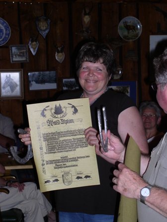 Een waardige afsluiting van deze dag was het uitdelen van het Walddiplom. Dit werd door Schorsch gedaan met veel grappen en grollen en de nodige schnaps. Uit wat hij zei bleek wel, dat we allemaal goed ons best hadden gedaan, maar het mooiste van alles was dat onze Henk met 174 punten de laagste score had behaald en Helga de beste van allen was met 224 punten!