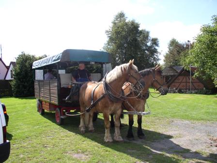 Onder een stralend blauwe hemel ontmoetten we elkaar bij de Kutscherstube in Bevern, waar we werden opgewacht door de koetsier Schorsch met zijn koets, getrokken door twee paarden die luisterden naar de namen Oscar en Peter. In die koets waren de nodige dorstlessende drankjes, heerlijk gekoeld, aanwezig, zodat het ons onderweg aan niets zou ontbreken.