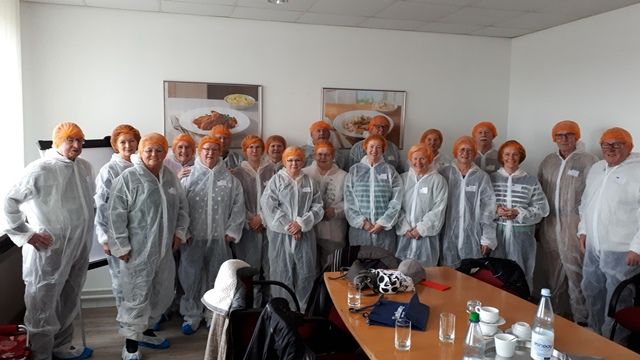 Om punt 10 uur stonden we bij de fabriek voor diepvries kant-en-klaar maaltijden voor de deur. Een echtpaar stond helaas 1 km verder voor de verkeerde deur, maar na een kwartiertje was de groep gelukkig weer compleet. De bedrijfsleider - dhr. Holder - had extra tijd voor ons genomen en gaf ons eerst enige informatie over het bedrijf. Hier worden per dag wel 80.000 kippen verwerkt. Daarna kregen we allemaal een geweldig leuke overall aan en extra voor ons Nederlanders had hij een leuk oranje haarnetje. De productie was erg indrukwekkend en hoewel in deze fabriek 100 mensen werken, hebben we er eigenlijk maar weinig gezien.