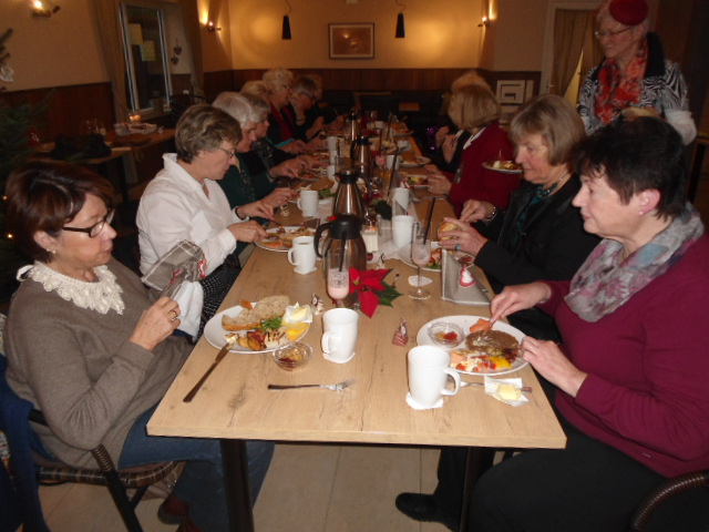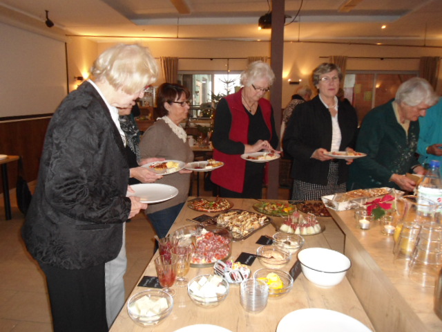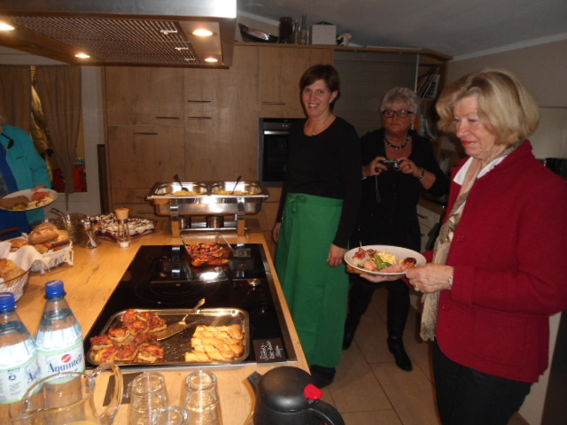 Onder het toeziend oog van de koeien, die naar de automatische melkinstallatie liepen, genoten 16 dames van heerlijke hapjes, zoals Weihnachtslasagne, omwikkelde pruimen, dadels, abrikozen, en broodjes met bijzonder beleg.