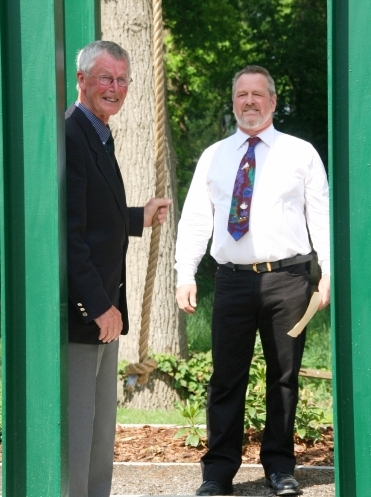 Hans Dilling (links), ältestes Mitglied der protestantischen Kirche in der ehemaligen Kaserne Seedorf, läutet den Glockenturm ein. Rechts Han de Vos, auf dessen Initiative der Turm nach Brauel kam.