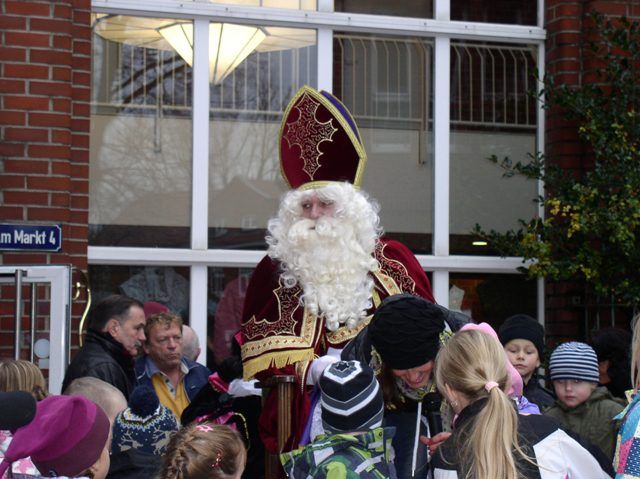 Vervolgens werd de Sint toegezongen met het zingen van enige, helaas Duitse, liedjes waarna de kinderen getrakteerd werden door de Pieten